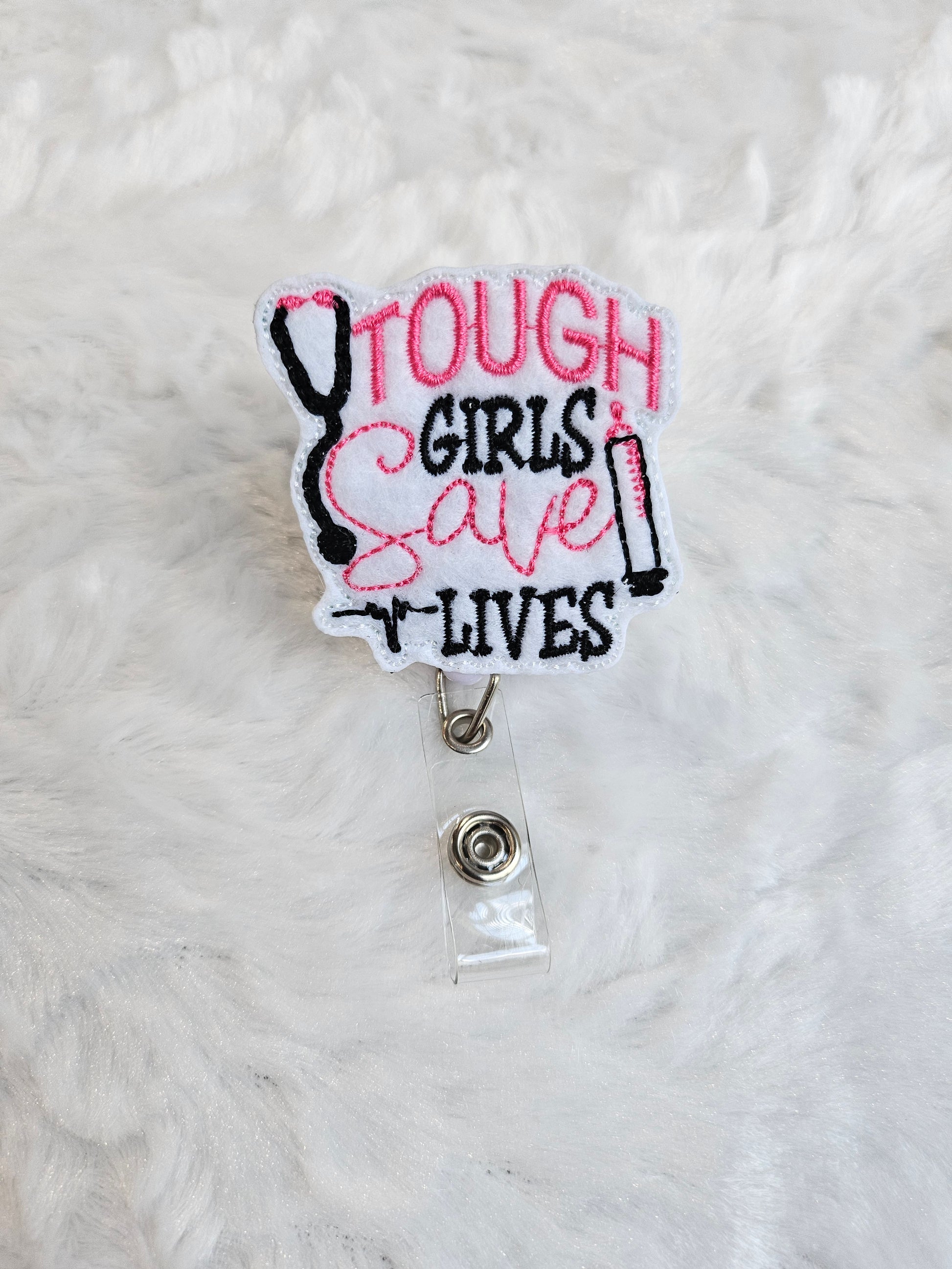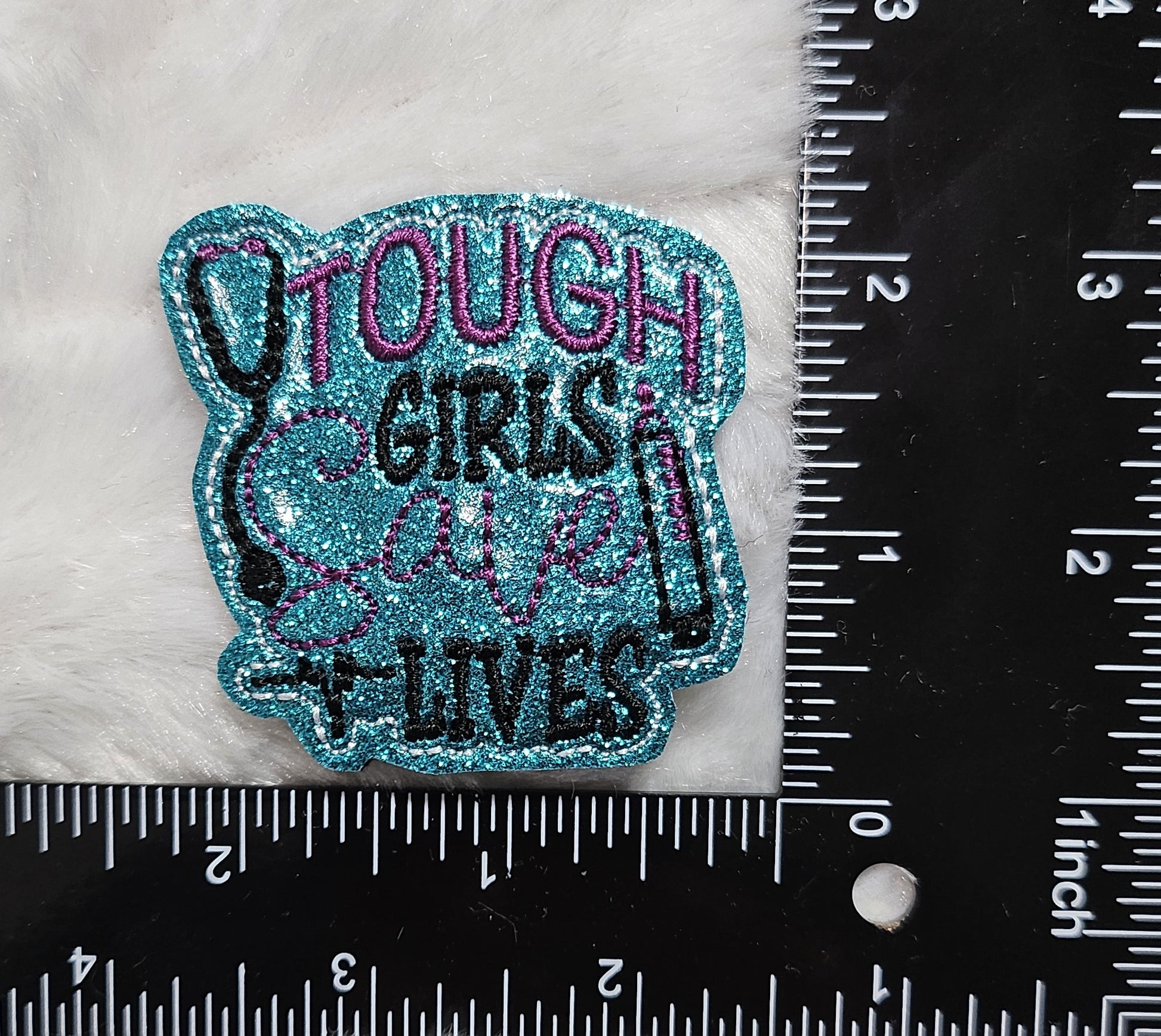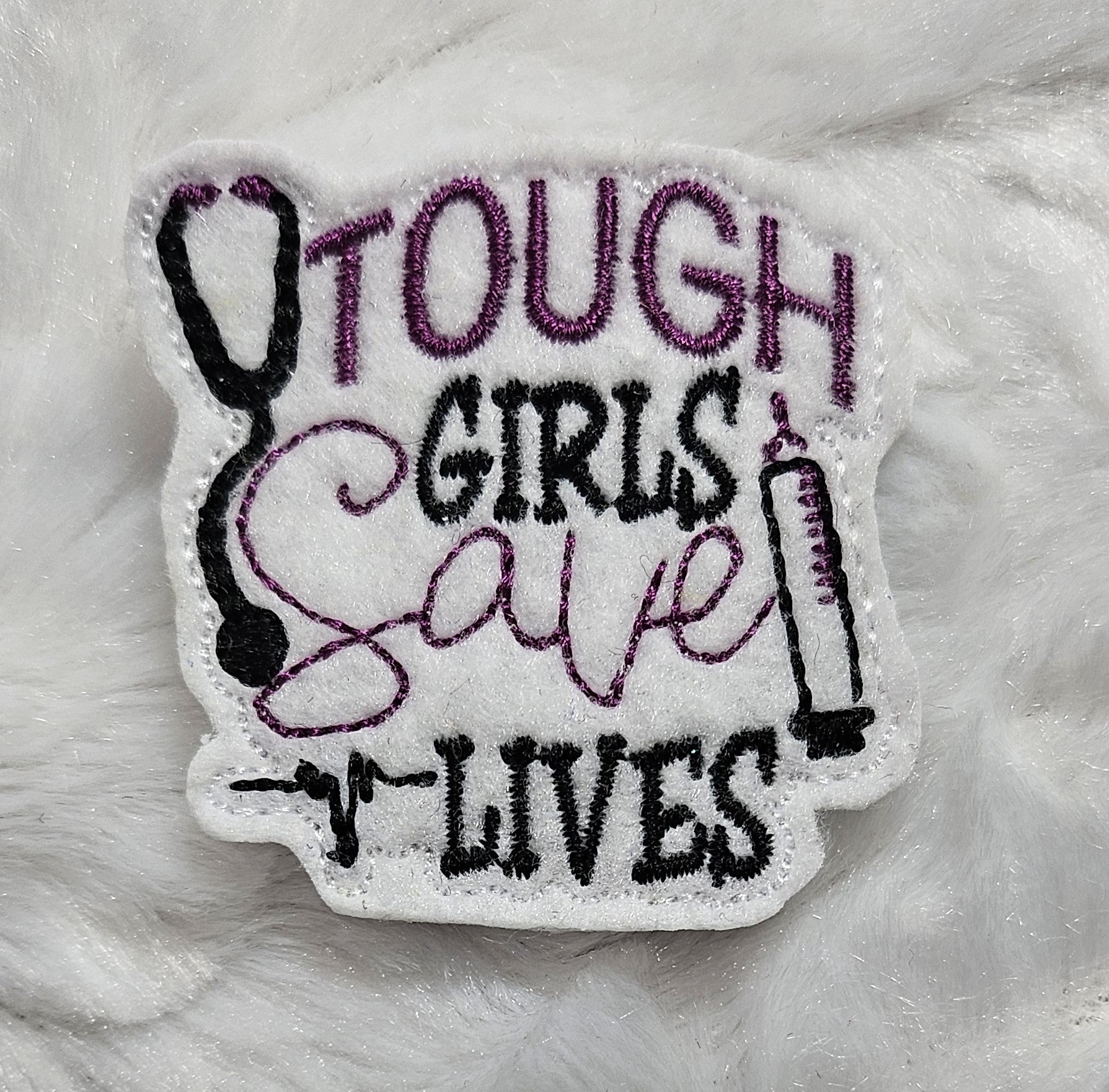 What a cool badge for all our wonderful tough nurses! This feltie is available in pink and black polyester thread onto a light green glitter vinyl with a felt backing or in purple and black thread with blue glitter vinyl. Both are available in a white all felt option as well.