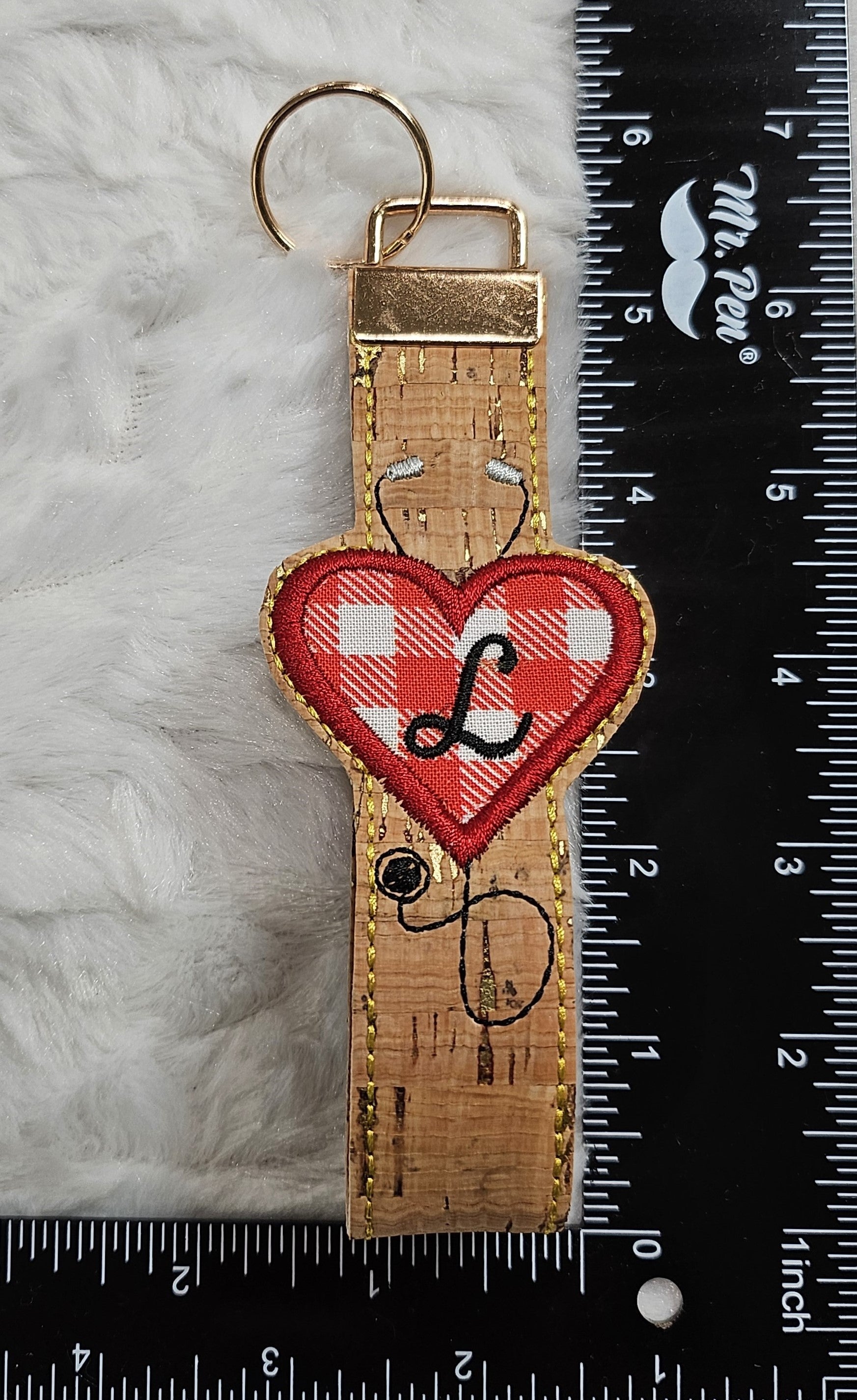 This made-to-order wristlet keychain is stitched onto cork fabric with golden flecks. It is 1 inch wide and measures 5 inches long. It has an applique heart-shape stethoscope with initial and comes with a key fob clamp and keyring. Choose your thread color, applique fabric, and clamp color.